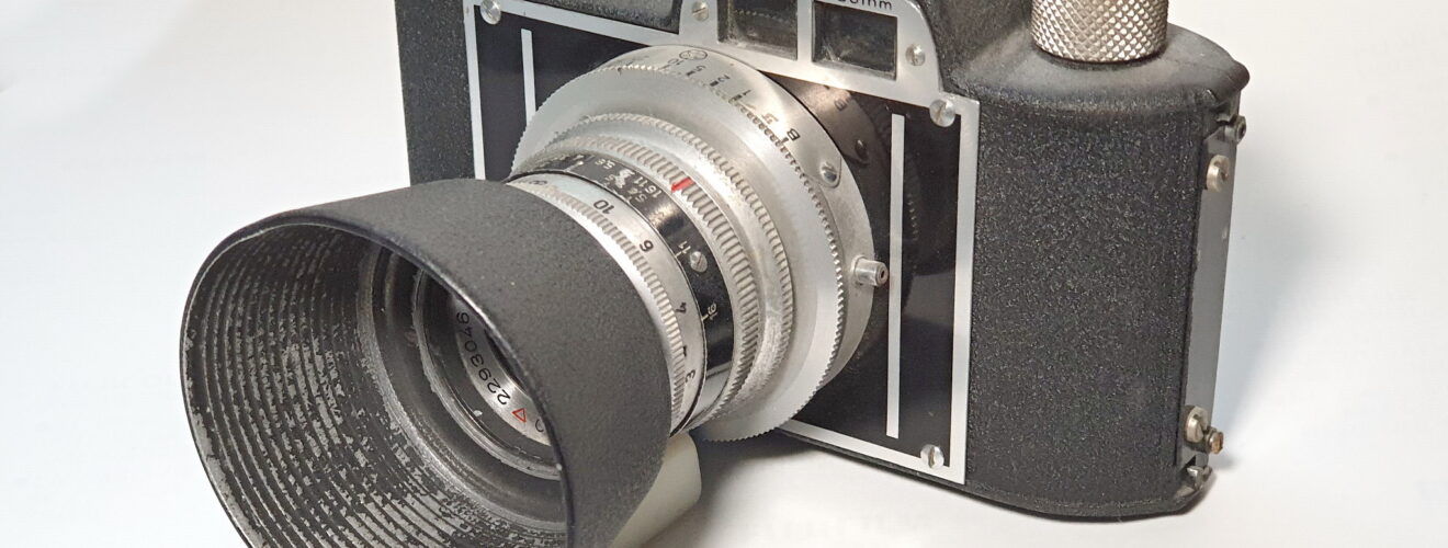 Unsere erste Kamera war eine Akarette 0 Baujahr 1949 mit dem Objektiv Schneider-Kreuznach 1:3,5 / 50 mm Nr. 2293048. Die Akarette ist eine 35mm Sucherkamera mit austauschbaren Objektiven und umschaltbarem Sucher zwischen 50 und 75mm Brennweite.